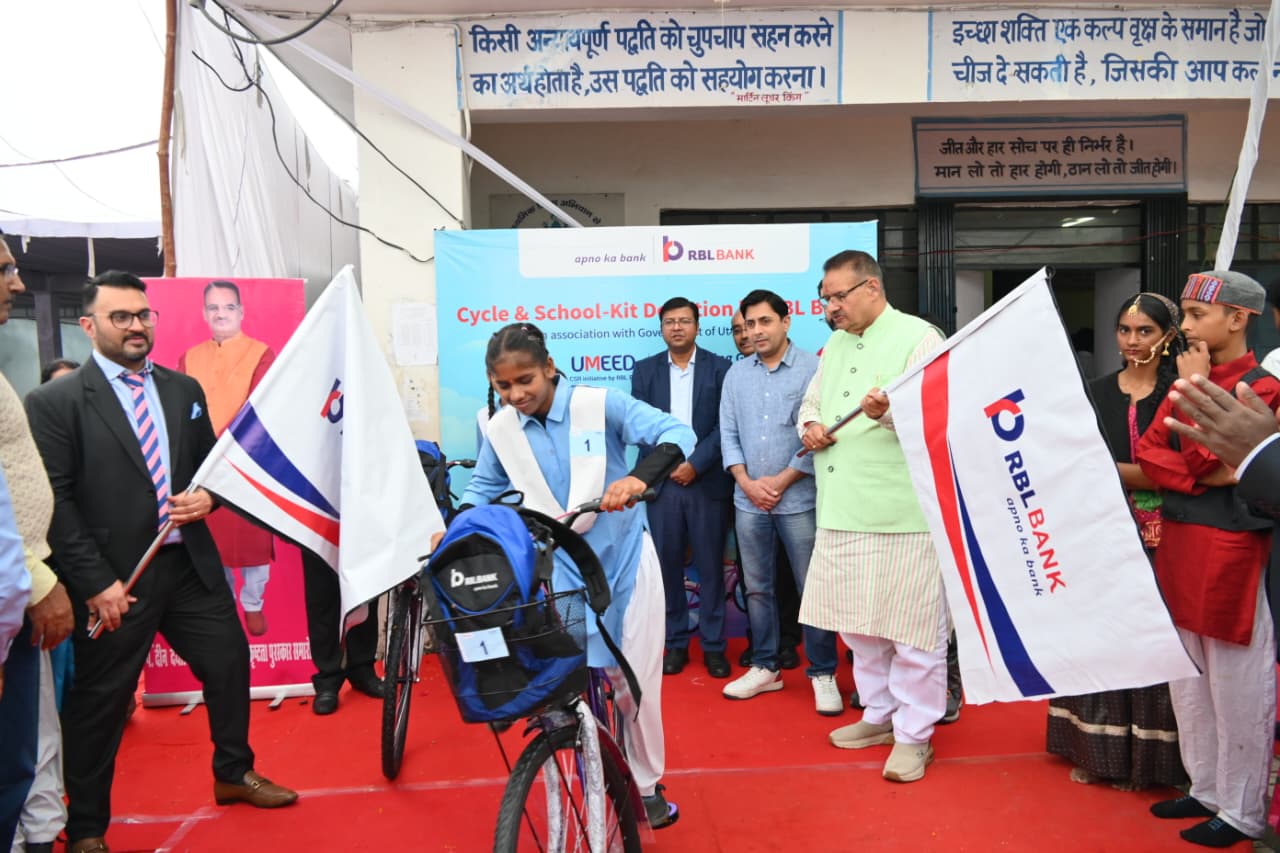 देहरादून, 08 अक्टूबर। कैबिनेट मंत्री गणेश जोशी ने आज किशनपुर स्थित राजकीय इंटर कॉलेज में “उम्मीद” एक पहल के अन्तर्गत आर.बी.एल. बैंक द्वारा आयोजित साइकिल वितरण एवं स्कूल कीट वितरण कार्यक्रम में बतौर मुख्य अतिथि प्रतिभाग किया। इस अवसर पर कैबिनेट मंत्री गणेश जोशी ने सी.एस.आर के तहत 18 विभिन्न राजकीय विद्यालयों में अध्ययनरत ग्रामीण एवं निम्न आय वर्ग की 300 स्कूली छात्राओं को साइकिल एवं स्कूल कीट वितरित की। इस अवसर पर मंत्री जोशी ने बालिकाओं को प्रोत्साहित करते हुए कहा कि शिक्षा ही सशक्तिकरण का सबसे बड़ा माध्यम है और सरकार का लक्ष्य है कि कोई भी बेटी शिक्षा से वंचित न रहे।