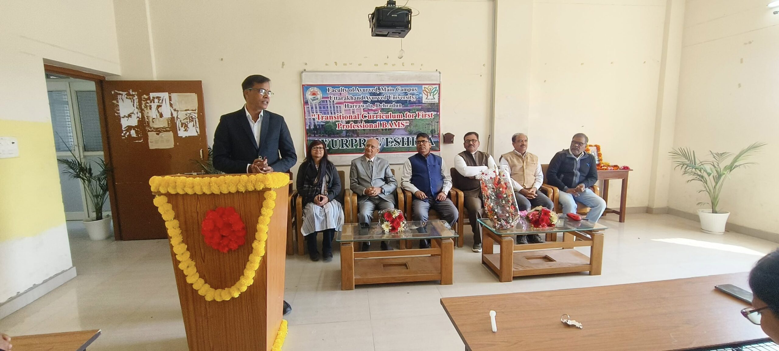 हर्रावाला (देहरादून) । उत्तराखंड आयुर्वेद विश्वविद्यालय, मुख्य परिसर हर्रावाला, देहरादून में बीएएमएस नवप्रवेशित विद्यार्थियों बैच 2025-26 हेतु भारत सरकार के एनसीआईएसएम द्वारा निर्देशित ट्रांजिशनल करिकुलम कार्यक्रम “आर्युप्रवेशिका” का आज विधिवत शुभारंभ किया गया। उद्घाटन कार्यक्रम की अध्यक्षता विश्वविद्यालय की कुलपति प्रोफेसर अरुण कुमार त्रिपाठी ने की। इस अवसर पर मुख्य अतिथि के रूप में आमंत्रित विद्वान वक्ता प्रोफेसर हरिमोहन चंदोला, पूर्व निदेशक, चौधरी ब्रह्मप्रकाश चरक आयुर्वेद संस्थान, नई दिल्ली उपस्थित रहे। प्रातः विश्वविद्यालय के मा०कुलपति , मुख्य अतिथि एवं मुख्य परिसर के निदेशक एवं डीन प्रो. (डॉ.) पंकज कुमार शर्मा ने संयुक्त रूप से दीप प्रज्ज्वलित कर धनवंतरी वंदना के साथ कार्यक्रम का आरंभ किया।उद्घाटन सत्र में कुलपति प्रो. अरुण कुमार त्रिपाठी ने अपने उद्बोधन में कहा कि आयुर्वेद जीवन का विज्ञान है और वर्तमान समय में संपूर्ण विश्व में आयुर्वेद की स्वीकार्यता और उपयोगिता तेजी से बढ़ रही है। उन्होंने बताया कि प्राकृतिक आहार-विहार, औषधि पद्धति, शोधन प्रक्रियाओं और आयुर्वेद में वर्णित आदर्श जीवन शैली, इसकी निरपट औषधिओ के कारण आयुर्वेद वैश्विक स्तर पर लोकप्रिय हो रहा है। प्रो.अरुण कुमार त्रिपाठी ने विद्यार्थियों से आग्रह किया कि वे आयुर्वेद को केवल एक पाठ्यक्रम न मानकर इसे एक सेवापरक और संभावनाओं से भरे करियर के रूप में अपने व्यक्तित्व का विकास करें । मुख्य अतिथि प्रो. हरिमोहन चंदोला ने आयुर्वेद के प्राचीन पंचमहाभूत्र दोस्त निर्गुण सिद्धांतों, आधुनिक वैज्ञानिक दृष्टिकोण, चिकित्सा की मूल अवधारणाओं एवं योग एवं आयुर्वेद के महत्व को प्रतिपादित किया। तथा एक उत्तम चिकित्सक बनने हेतु आवश्यक गुणों पर विस्तार से अपनी बात रखी। उन्होंने विद्यार्थियों को आयुर्वेद को व्यवहार में उतारने, शोध में आगे बढ़ने और रोगियों की सेवा में समर्पित रहने की प्रेरणा दी। मुख्य परिसर के निदेशक एवं डीन प्रो. (डॉ.) पंकज कुमार शर्मा ने ट्रांजिशनल करिकुलम की संकल्पना, आवश्यकता और 15 दिवसीय इंडक्शन प्रोग्राम की शैक्षणिक उपयोगिता पर प्रकाश डाला। उन्होंने कहा कि आयुर्वेद केवल एक प्रोफेशन नहीं बल्कि मानवता की सेवा का माध्यम है। अष्टांग आयुर्वेद के सम्यक अध्ययन से विद्यार्थी चिकित्सा, शोध, औषध निर्माण, डिजिटल हेल्थकेयर तथा संबंधित क्षेत्रों में उत्कृष्ट अवसर प्राप्त कर सकते हैं। इस कार्यक्रम में वाइट कोट सेरेमनी के अंतर्गत विश्वविद्यालय के कुलपति एवं मुख्य अतिथि प्रश्न निदेशक द्वारा संयुक्त रूप से विद्यार्थियों को व्हाइट कोट(एप्रोन) प्रदान किया गया। तथा उत्तराखंड सरकार द्वार