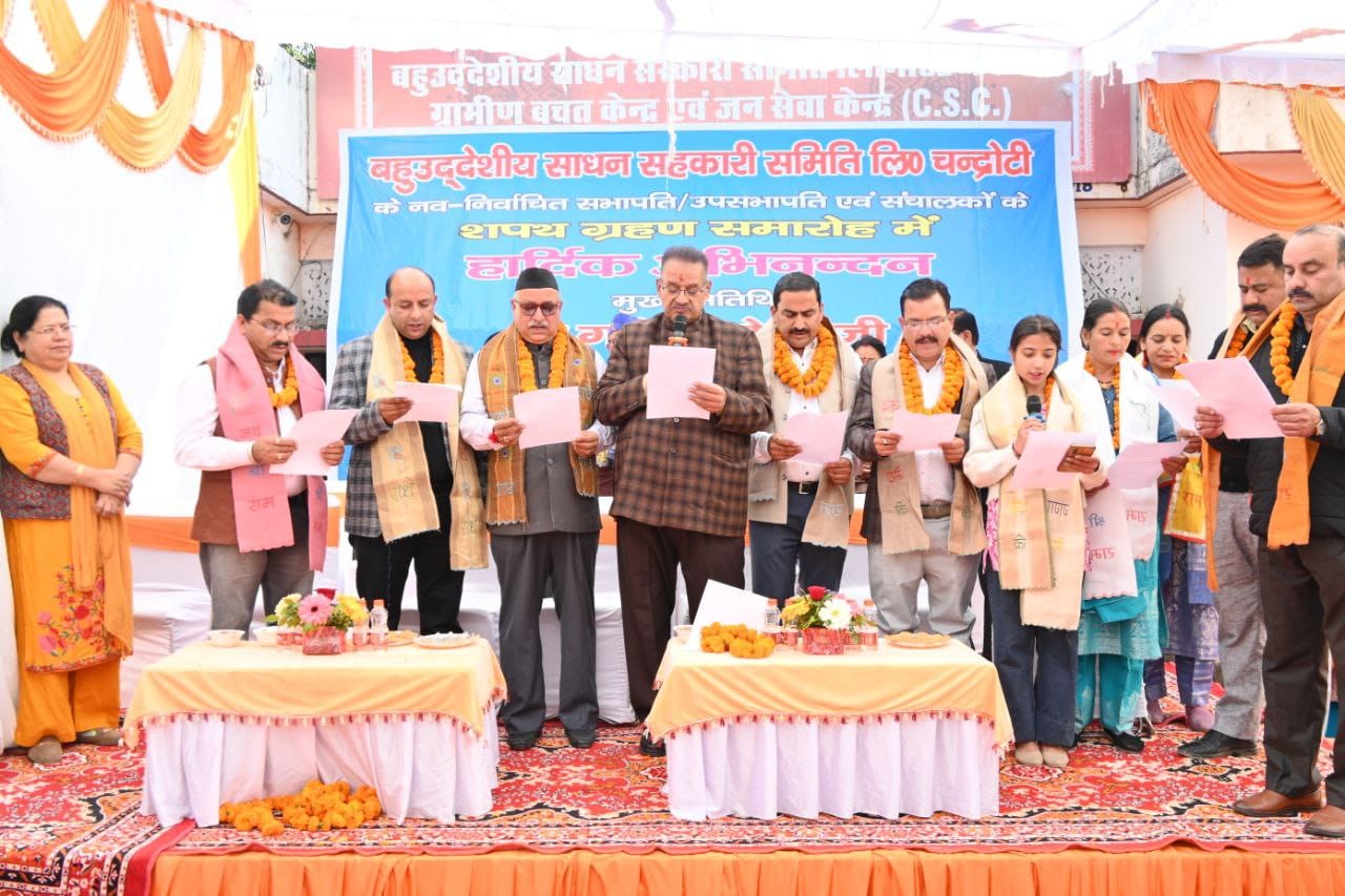 बहुउद्देशीय साधन सहकारी समिति लिमिटेड चन्द्रोटी के नव-निर्वाचित सभापति, उपसभापतियो के शपथ ग्रहण समारोह में प्रतिभाग करते कैबिनेट मंत्री गणेश जोशी